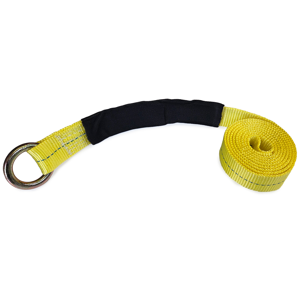 Gator lasso strap has (1) loops around the tire and is attached to the trailer or wheel fork. Measures 2" x 8 ft. long and has a 3300lb working load limit. Used on century, challenger and nomar brand lifts as well as others. This unit has a 9,000 lb welded o ring on the end. This unit comes with a 10 inch cordura sleeve to protect the back side on the front axle area.